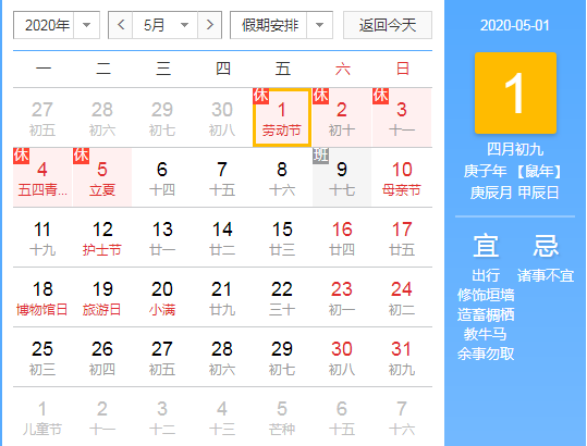 5月1日(星期五)至5日(星期二)放假調休,共5天。另外5月9日(星期六)上班。放假時間與國務院放假安排相同。