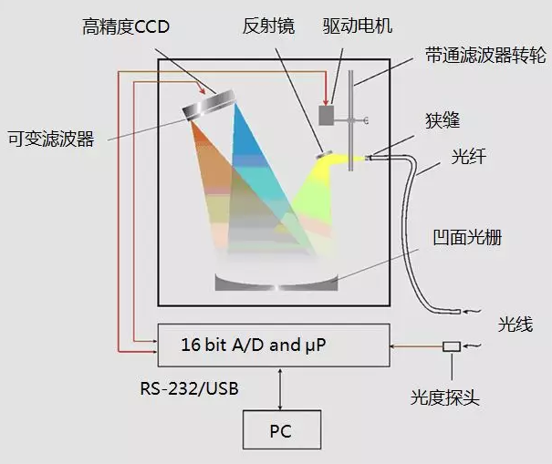 按分光系統(tǒng)分類(lèi):棱鏡分光光譜儀、光柵分光光譜儀、濾色片分光光譜儀