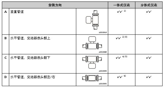 2) 電子部件過熱危險! 流體溫度超過200 °C (392 °F)時,標稱口徑為DN 100 (4")和DN 150 (6")的夾持式 儀表(Prowirl D)禁止采用安裝方向B。